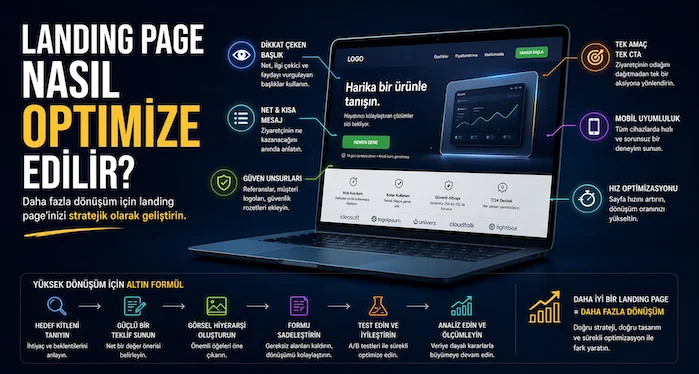 stratejisi; net başlık, güçlü değer önerisi, hızlı sayfa yapısı, mobil uyumluluk, güven sinyalleri, sade form alanları ve doğru konumlandırılmış çağrı butonlarının birlikte çalışmasıyla oluşur.