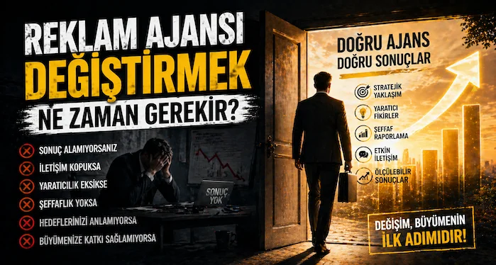 Reklam ajansı değiştirmek; sonuç alınamayan kampanyalar, zayıf raporlama, ilgisiz iletişim, strateji eksikliği ve büyümeyen dijital görünürlük devam ediyorsa gündeme gelmelidir.