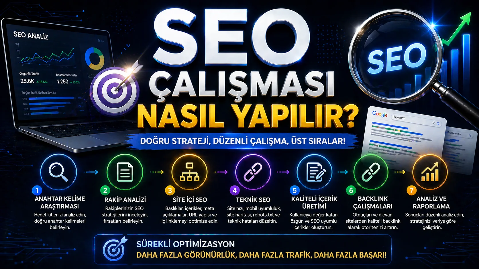 SEO çalışması nasıl yapılır sorusunun cevabı; teknik altyapı, doğru içerik, Google Maps görünürlüğü, backlink otoritesi, kullanıcı deneyimi ve ölçümleme adımlarının birlikte yönetilmesidir.